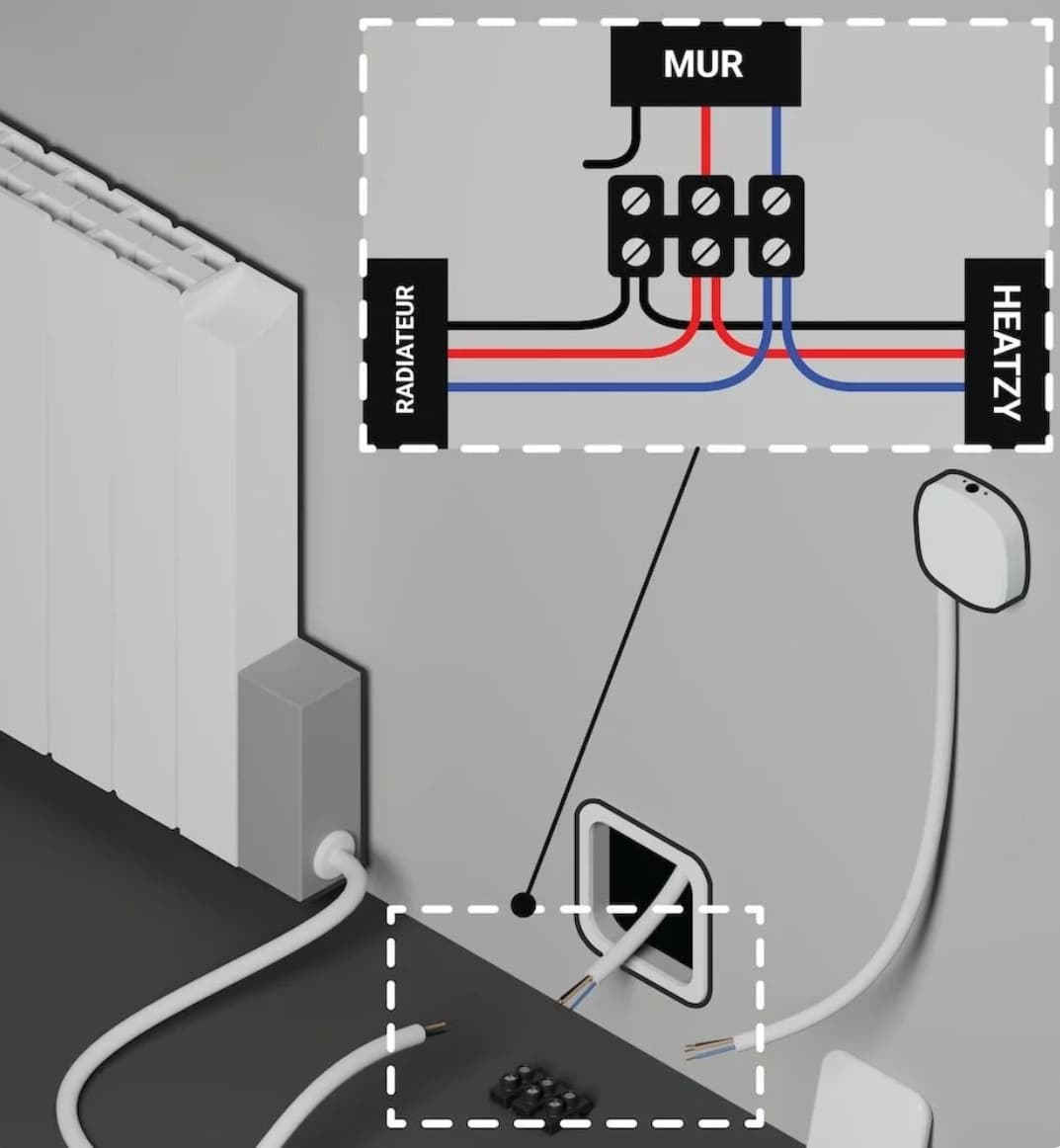 Les thermostats connectés, ce sont de petits modules placés à proximité des radiateurs électriques. Ils peuvent s’adapter à de nombreux systèmes : radiateurs muraux, sèche-serviettes, voire planchers chauffants ou même chauffe-eau, à la condition qu’ils soient équipés d’un fil pilote – un standard depuis les années 1990. Le thermostat va se greffer sur ce fil pilote, et, à partir de la température de consigne fixée à chaque radiateur électrique, transformer ce dernier en radiateur connecté.