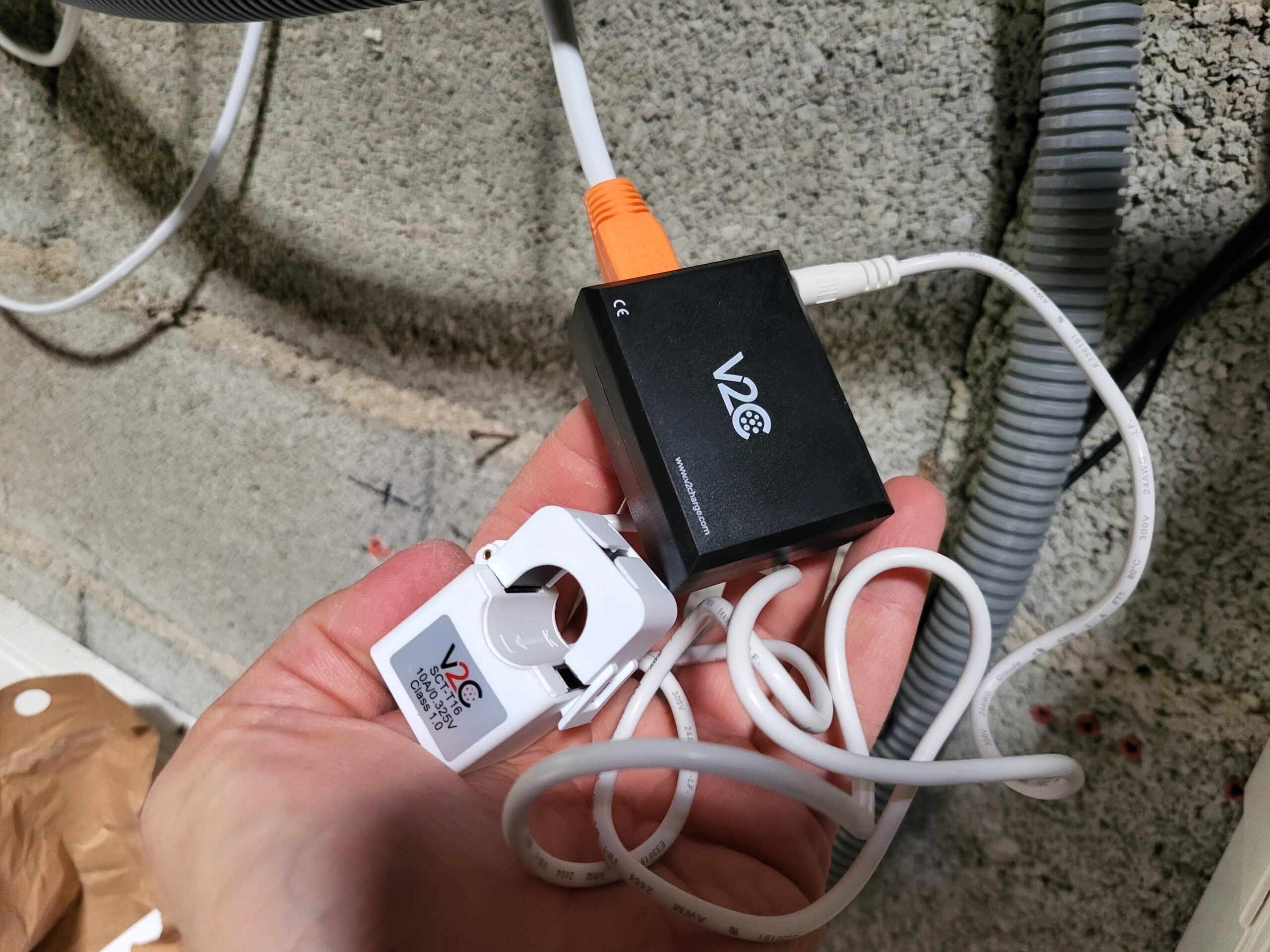 La borne est fournie avec un petit module « V2C Controlbox » qui permet d’utiliser la fonction de délestage et d’ajustement de la puissance en fonction de la production photovoltaïque. Ce boîtier doit être relié d’une part à la borne par un câble Ethernet, d’autre part, à une pince ampèremétrique (fournie) à placer sur la phase alimentant la borne. Pour la fonction solaire, une seconde pince doit être placée sur la phase de la centrale solaire, sauf si cette dernière est équipée d’un onduleur compatible ou si vous associez la borne à un compteur sans fil compatible (Shelly, par exemple).