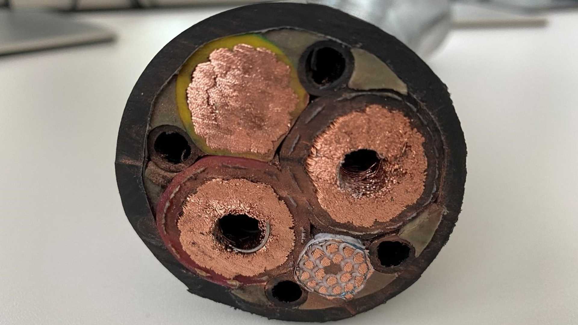 On y voit ainsi d’épais conducteurs pour les pôles positifs et négatifs et la mise à la terre. Faute d’une tension suffisamment élevée, ces derniers doivent être surdimensionnés pour tolérer l’intensité colossale qui y circule. Plusieurs tubes d’eau glycolée permettent d’ailleurs d’évacuer l’excès de chaleur. La gaine contient également des lignes dédiées aux communications entre la borne et l’appareil en charge.