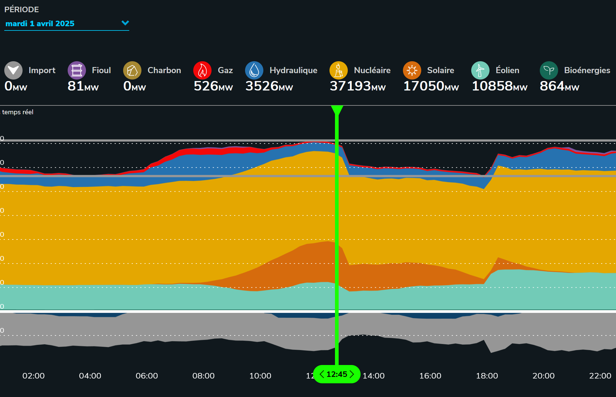 Ce n’est pas un poisson. Le 1ᵉʳ avril 2025, à 13 heures, la France aurait frôlé le blackout. Brutalement, le réseau électrique a perdu 9 gigawatts (GW) de production photovoltaïque, soit l’équivalent de neuf réacteurs nucléaires. Un début de scénario proche de celui subi par l’Espagne, 28 jours plus tard. Si l’évènement n’a pas causé de panne, la fréquence du réseau, qui doit être maintenue en permanence à 50 Hz, en a pris un coup.