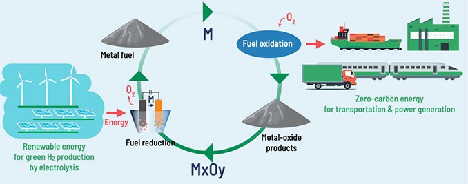 Lorsque la poudre métallique est utilisée, de l’oxygène est consommé, et le métal est transformé à nouveau en oxyde – c’est une réaction de combustion, tout comme celle des hydrocarbures. L’oxyde est ensuite retourné à son lieu de réduction, où il sera à nouveau transformé en métal pour enclencher un nouveau cycle. Un cycle qui offre le potentiel de ne pas être carboné.