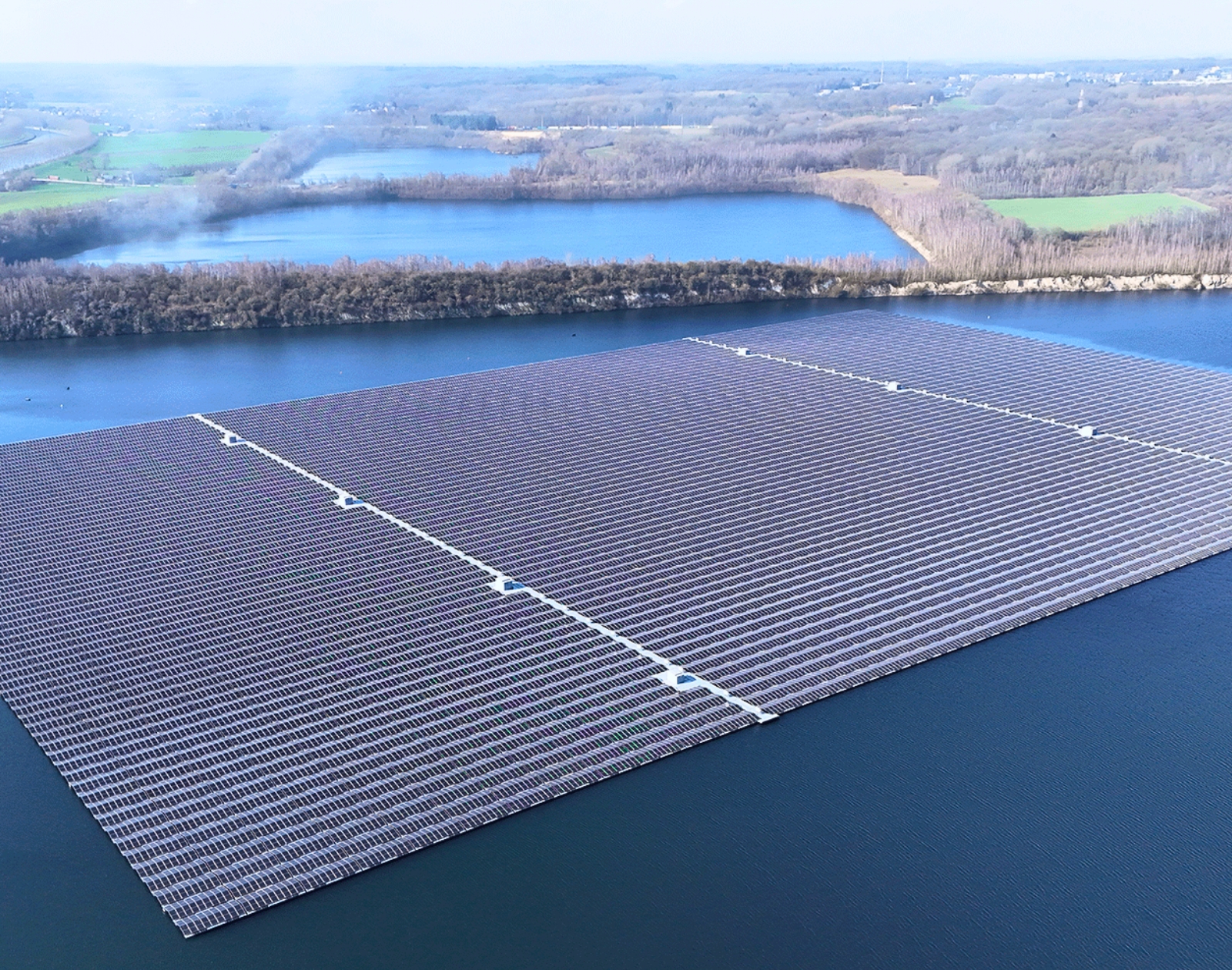 Installée sur un ancien site d’extraction de craie réhabilité en lac, la centrale est dotée de panneaux bifaciaux qui profiteront de la réflexion du soleil sur la surface de l’eau, augmentant ainsi sa production. L’intégration paysagère du site a été particulièrement soignée, avec un forage dirigé de 700 mètres de long entre la centrale et le poste de transformation et ses 64 onduleurs.