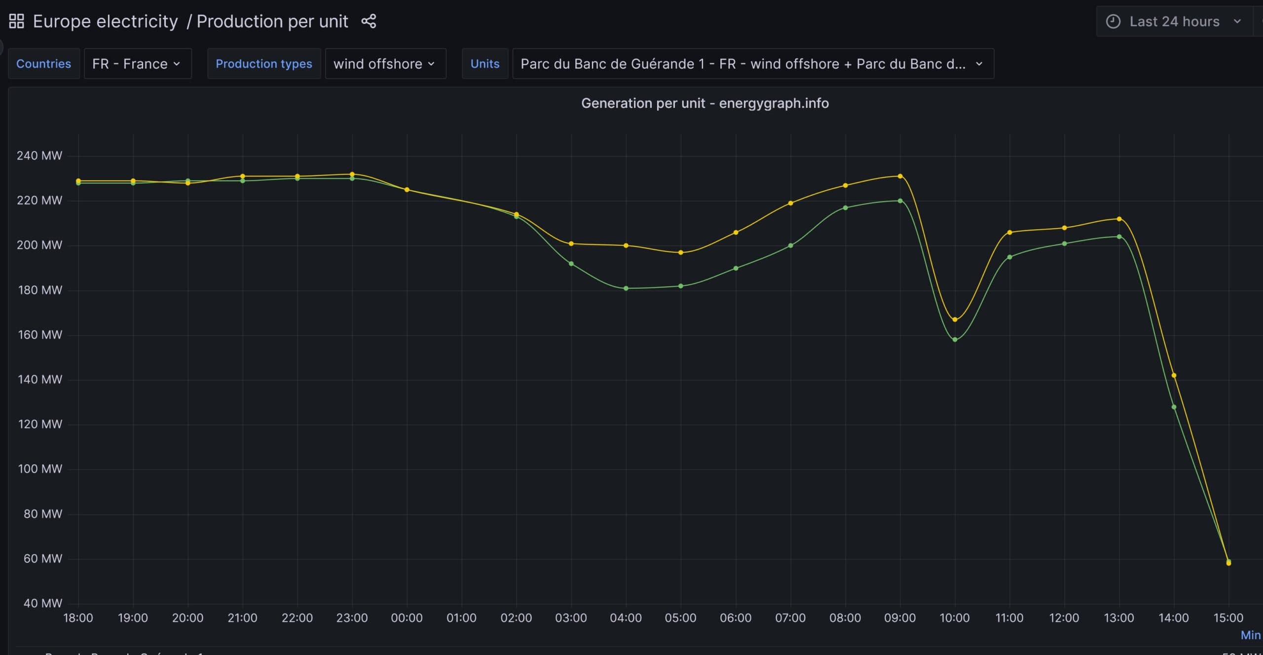 À lire aussiVoici la production phénoménale du premier parc éolien en mer de FranceGrâce à son tableau de bord, il est donc possible d’observer la courbe de puissance du parc éolien de Saint-Nazaire au pas horaire depuis le 10 janvier 2023. Le parc, d’une puissance totale de 480 MW pour 80 turbines, est techniquement séparé en 2 fermes de 240 MW. Le graphique présente ainsi 2 courbes à peu près similaires, prenant la forme de vertigineuses montagnes russes.