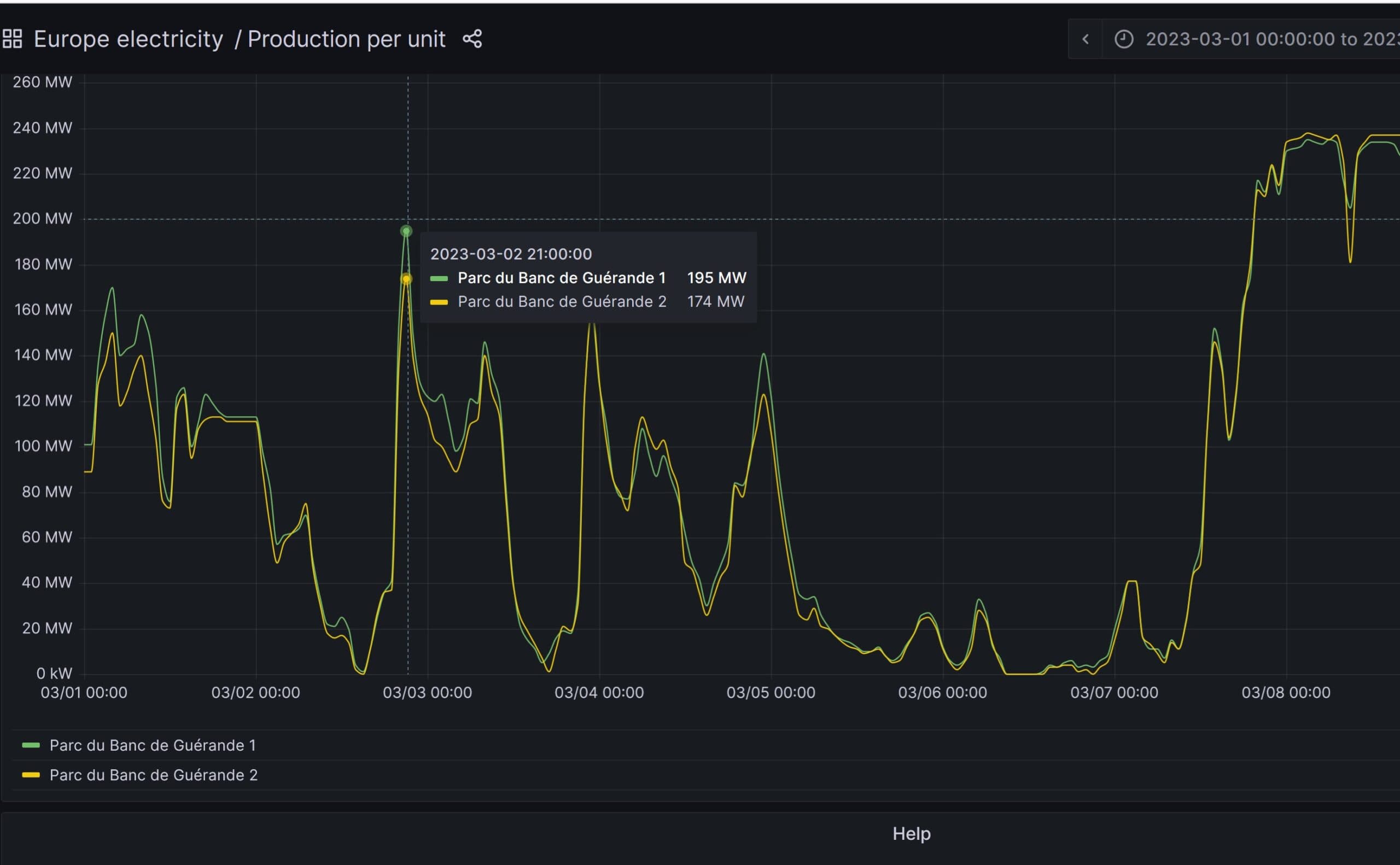 Sur les 10 premiers jours du mars 2023 par exemple, la puissance a varié de… 0 MW (le 6 mars entre 9 h et 14 h, production nulle) à 473 MW (le 8 mars à 3 h du matin, soit 98,5 % de facteur de charge à cet instant). Rien de bien étonnant toutefois, la production des éoliennes suit logiquement les fluctuations de vitesses du vent.