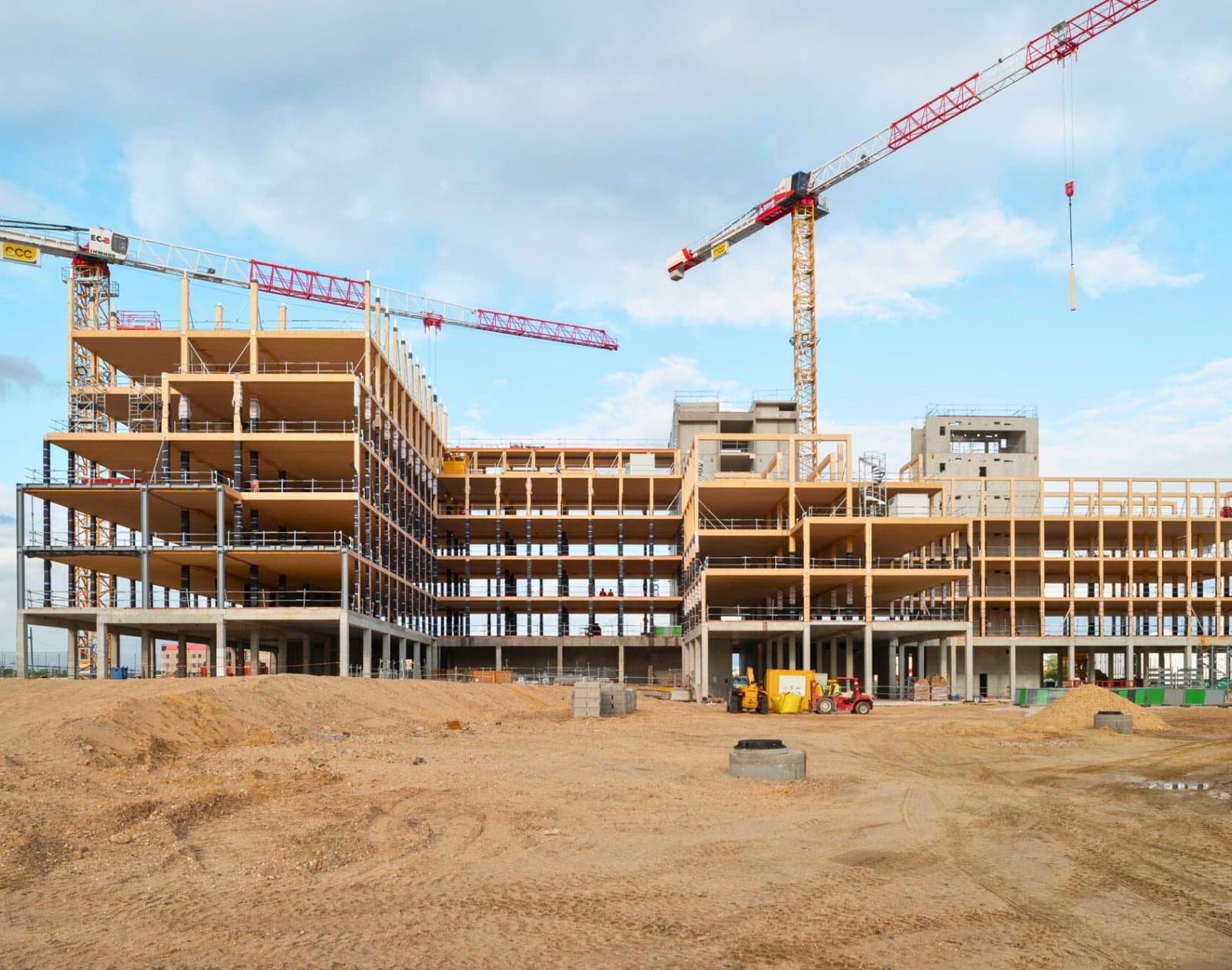 En ce qui concerne le dioxyde de carbone, la méthode d’analyse du cycle de vie (ACV) conduit à des émissions de 673 kg-CO2eq/m2 de surface de plancher. C’est une division par deux par rapport à un bâtiment en béton conventionnel qui aurait été conçu entre 2019 et 2021, soit 1 260 kg-CO2eq/m2. Car, si les ossatures sont en bois, le noyau et les fondations de chaque bâtiment ont bien été construits en béton. Le recours au bois a permis de réduire l’utilisation du béton, un matériau dont la fabrication est une source majeure de gaz à effet de serre.