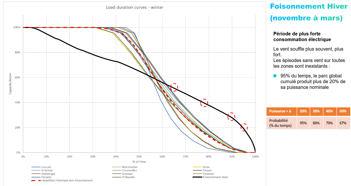 À lire aussiLes 3 parcs éoliens terrestres les plus puissants du mondeLors du débat public EOS relatif aux éoliennes flottantes en Méditerranée, Engie a publié une étude portant sur le foisonnement éolien. Cette étude concerne l’ensemble des façades maritimes françaises dans le contexte des différents projets de parc d’éoliennes en mer. Elle conclut ainsi : « À l’échelle des 3 façades françaises (Manche, Atlantique, Méditerranée), il est confirmé que les régimes de vent sont complémentaires au niveau temporel, entraînant un foisonnement de la production éolienne ; Ainsi, sur l’année, les statistiques montrent qu’un parc éolien réparti entre les façades produirait plus de 20 % de sa puissance installée de façon quasi constante (90 % du temps), ce ratio montant à près de 30 % en période hivernale (où la demande d’électricité est plus forte). »