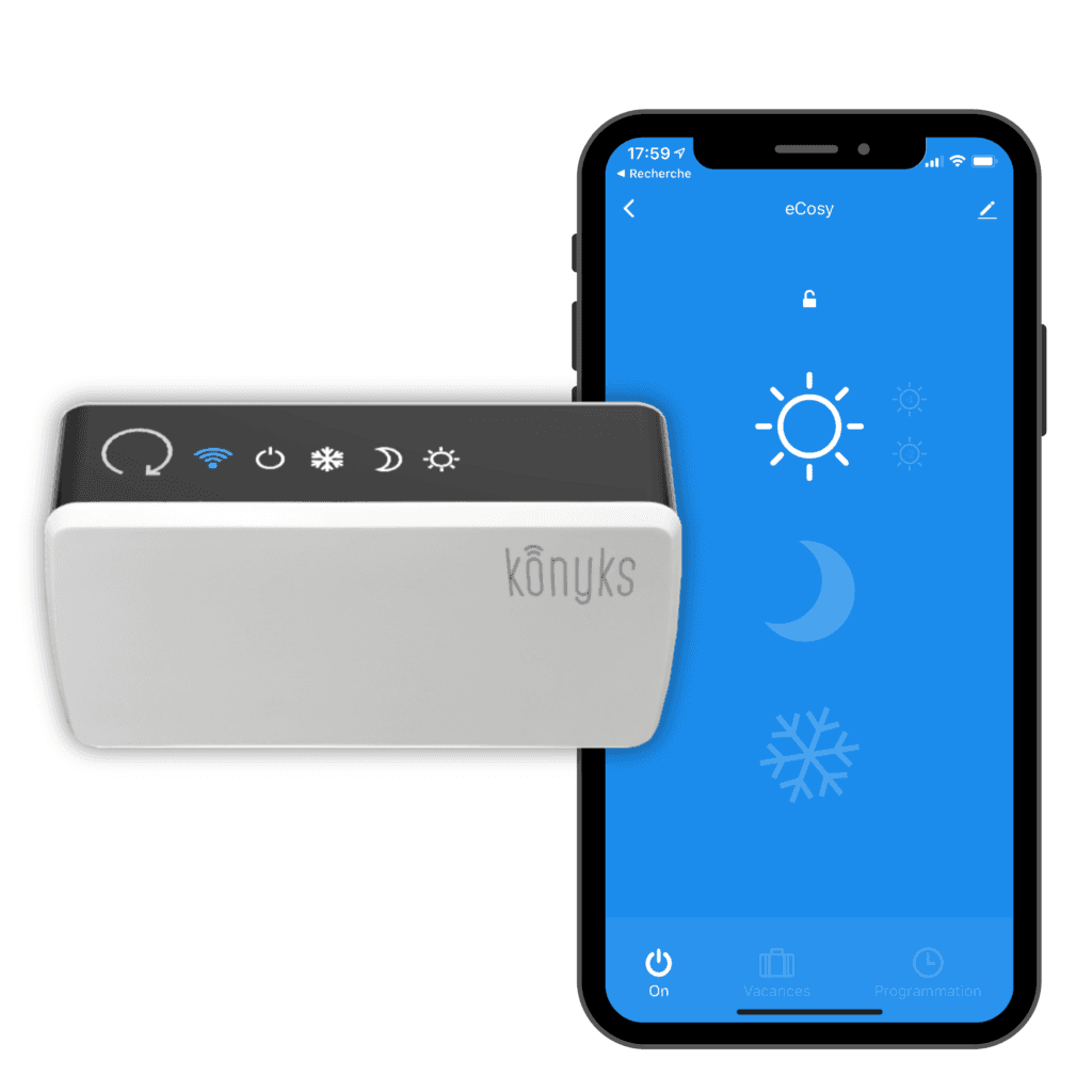 L’application Konyks est gratuite et disponible sur iOS et Android. Elle est compatible avec la commande vocale Alexa d’Amazon ou l’Assistant Google. La connexion se fait également par WiFi sur la bande 2,4 GHz. À noter que ce produit a été développé en collaboration avec la société Heatzy, citée précédemment.