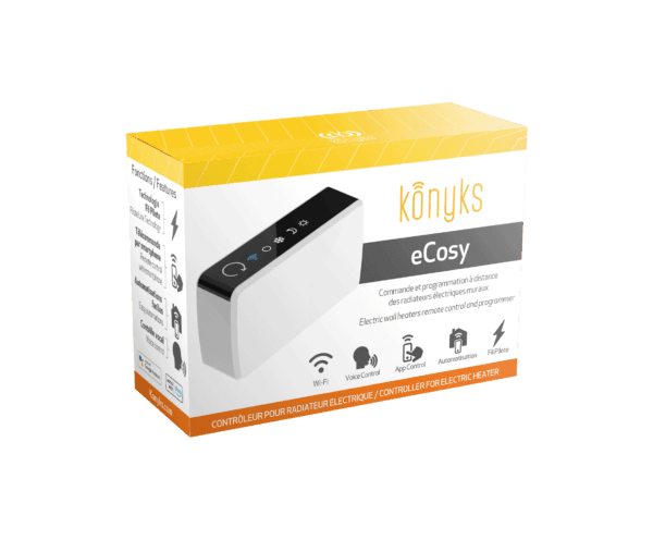 Le eCosy a été développé par la société Konyks. Plusieurs modes sont disponibles : Confort, Confort -1 °C, Confort -2 °C, Eco (-3,5 °C), Hors Gel et Off. Ce produit bénéficie en outre de sa compatibilité avec la large gamme de produits domotiques commercialisés par Konyks. Cela permet toute une variété de modes de programmation, par exemple : si une fenêtre est ouverte ou non (avec le détecteur Senso), ou si un autre appareil est allumé ou éteint, par exemple une caméra (avec la prise Priska).