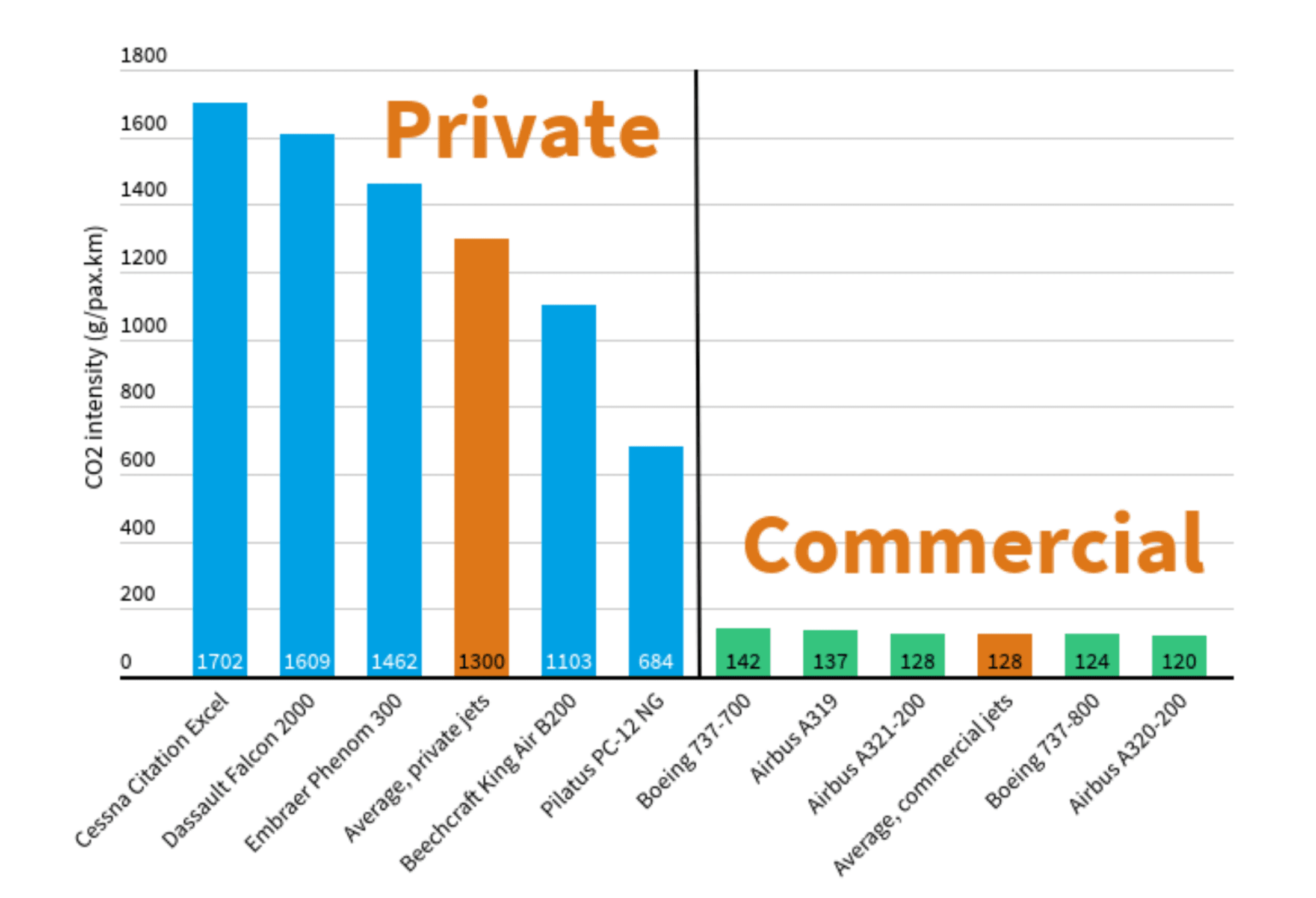 À lire aussiTourisme spatial : ces hypers riches consomment en 10 minutes autant d’énergie qu’un milliard d’humains en une vieL’aviation d’affaires rejette 400 000 tonnes de CO2 chaque année en Europe selon l’ONG The Shift Project. Si ce volume n’est pas colossal par rapport à d’autres industries -il représente 2% des émissions globales du transport aérien européen-, il est bien trop élevé au regard du faible nombre de passagers transportés. D’après Transport & Environment, une autre ONG, l’impact carbone d’un jet privé est de 1 300 g de CO2 par kilomètre et par passager, là où un avion commercial moyen affiche 128 g de CO2/km/passager.