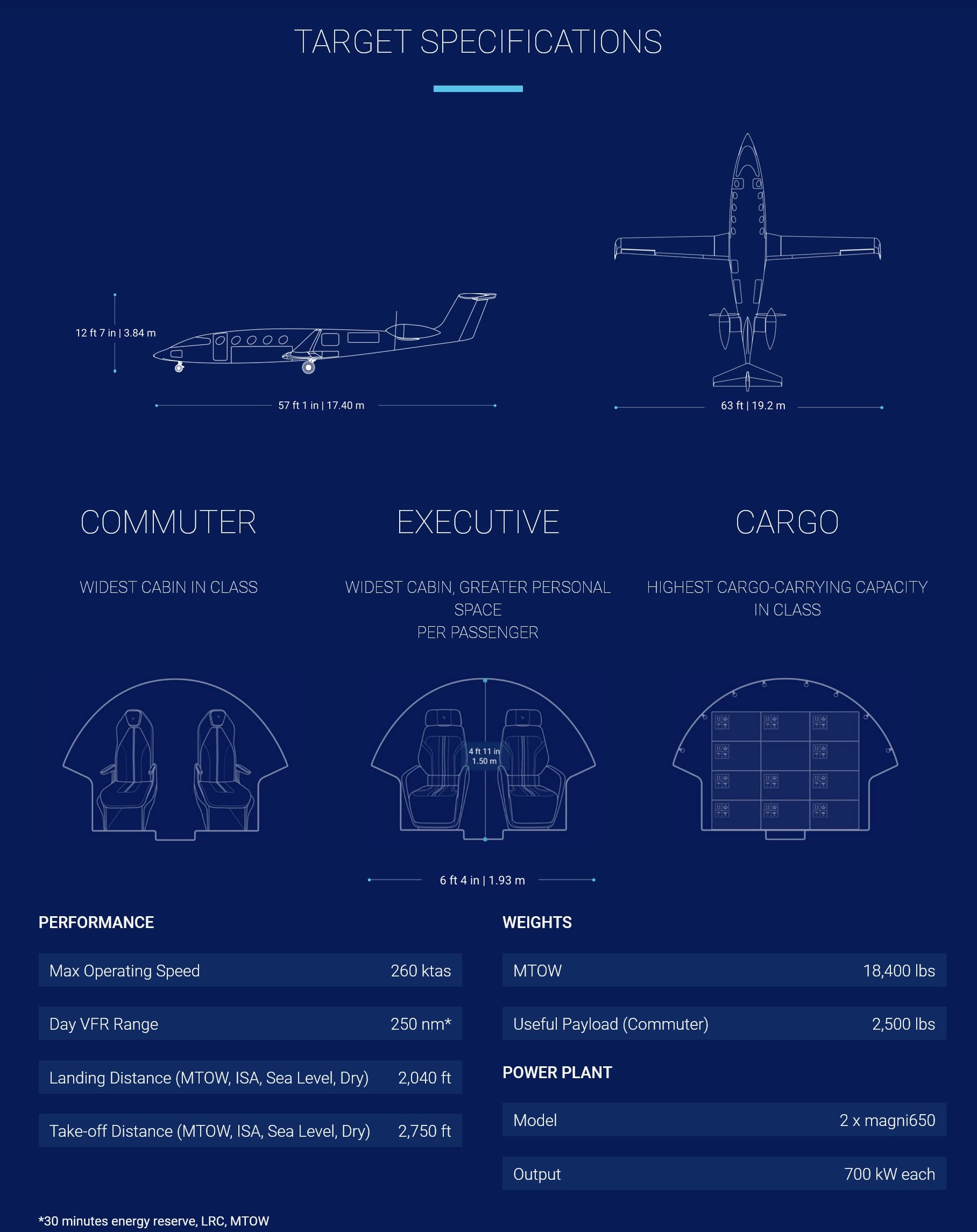 Le jet 100 % électrique sera décliné en trois versions : « executive » à 6 passagers, « commuter » pour les vols commerciaux avec 9 passagers et « cargo » avec 12,7 m³ de volume disponible pour le fret. À sa mise en service commerciale prévue pour 2024, il pourra emporter jusqu’à 1 136 kg de charge utile sur une distance de 240 à 400 km. Sa vitesse maximale est fixée à 260 nœuds (481,5 km/h).