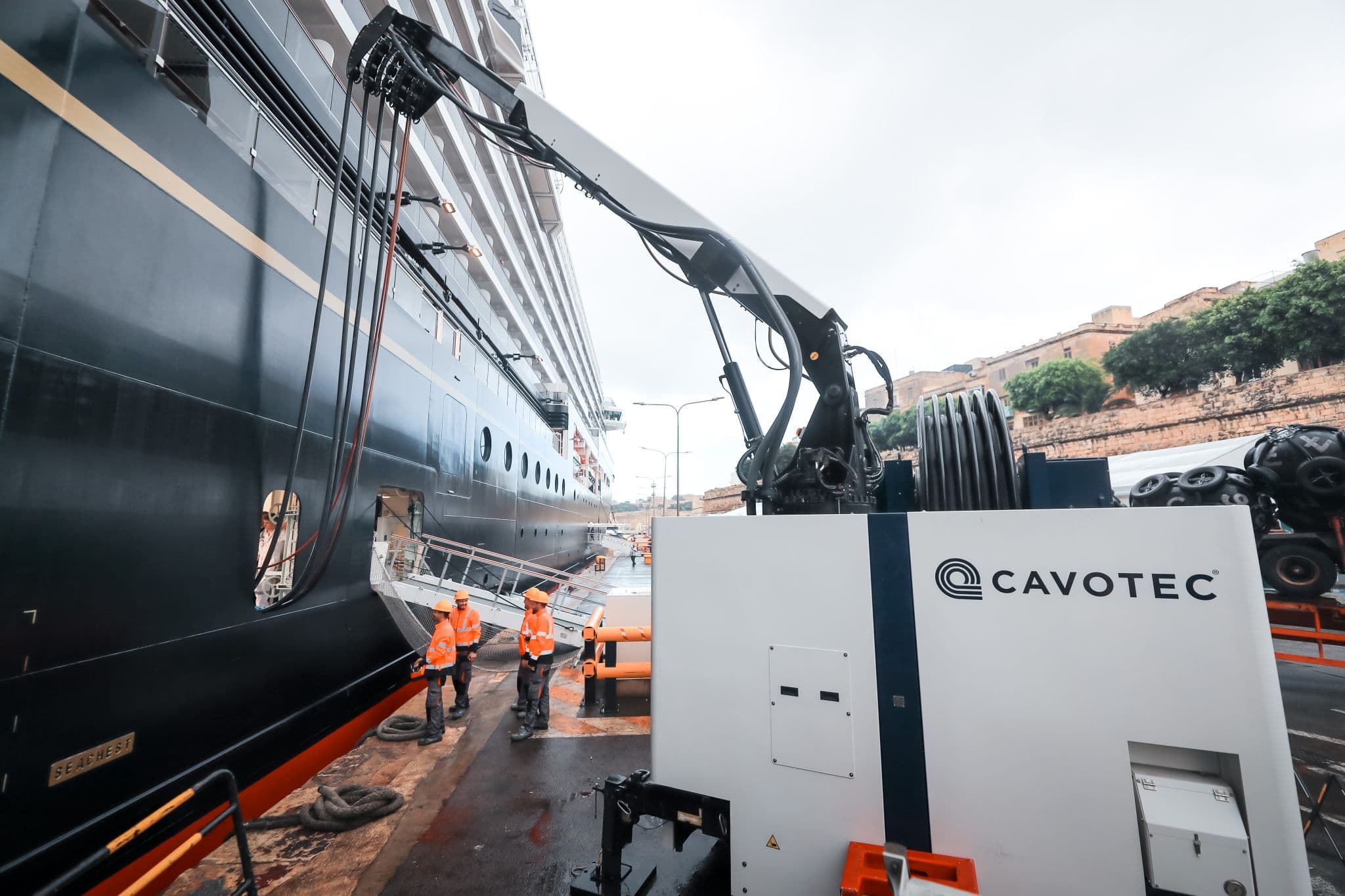 Pour ces géants des mers, pas de potence fixe, mais des « engins de levage qui se déplacent à l’endroit où se fait la connexion au navire, qui est différent sur chaque paquebot », détaille Patrick Maddalone, le directeur de la transformation du GPMM. Concrètement, l’engin se connecte à une borne de livraison fixe sur le quai puis soulève les cinq câbles jusqu’au point de branchement sur la coque des navires. « Il faut au moins trois personnes pour réaliser la connexion », assure-t-il. La puissance délivrée au paquebot pourra atteindre 16 MW, soit cinq fois plus que pour les ferrys.