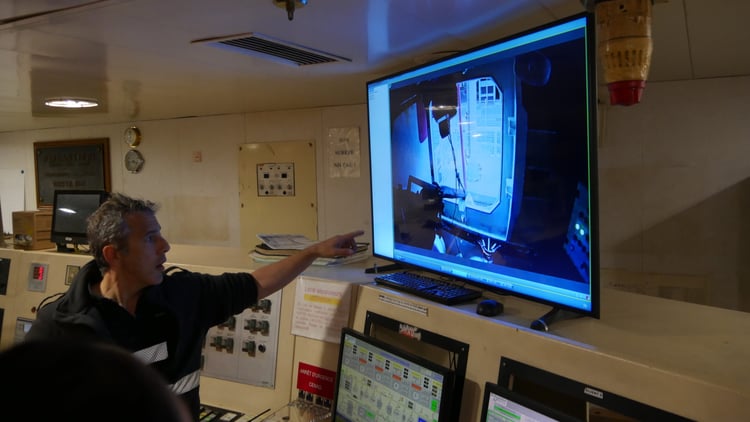 Pour se brancher au réseau après s’être amarré, le personnel du navire utilise une télécommande pour piloter la potence située sur le quai. « L’opération peut se faire à une personne, mais idéalement il en faut deux équipées », détaille le chef mécanicien. Le processus de raccordement dure une quinzaine de minutes, à l’arrivée comme au départ. Une fois branché, une séquence de basculement automatique est enclenchée par les ordinateurs de bord. Sans batteries tampon, les groupes électrogènes s’arrêtent progressivement afin de laisser les électrons « propres » du réseau alimenter le ferry. « Il nous a fallu six mois pour mettre au point cet automatisme », explique le responsable.