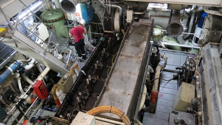 À bord, les cinq groupes électrogènes de 2 360 kW chacun, d’énormes moteurs dont les pistons ont un diamètre comparable à une roue de voiture, sont éteints. Toute l’énergie nécessaire au navire à quai est fournie par le réseau électrique national. Le ferry s’y est branché au moyen d’une potence installée sur le quai, supportant un épais câble. Une ouverture a d’ailleurs dû être découpée sur la coque pour aménager le point de connexion, abrité par un local visible dans l’un des garages du navire.