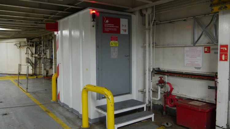 Cette connexion à quai peut fournir jusqu’à 2 500 kW selon le Grand port maritime de Marseille (GPMM), mais d’après Jean-Philippe Castelein, chef mécanicien du Danielle Casanova, elle serait en réalité supérieure : jusqu’à 3 800 kW. Lors de notre visite, la consommation du navire en escale prolongée, sans passagers, n’est que de 650 kW. Elle atteindrait les 3 000 kW en été, lorsque la climatisation est allumée, un poste de consommation qui serait plus élevé que le chauffage, sur un ferry.