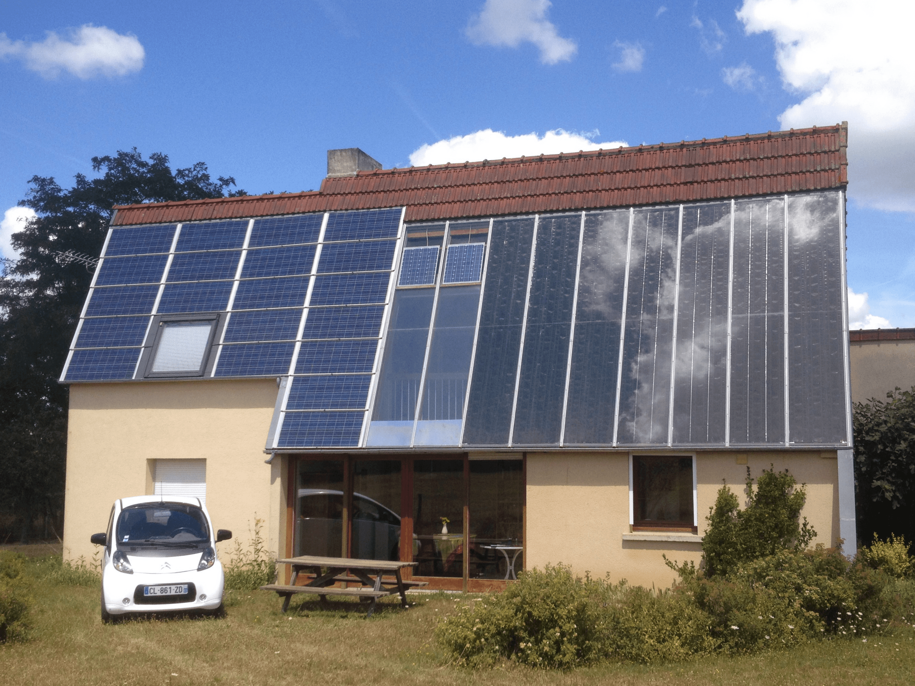 La maison de Jean-Louis Gaby en l’état actuel (panneaux photovoltaïques à gauche, panneaux solaires thermiques à droite).