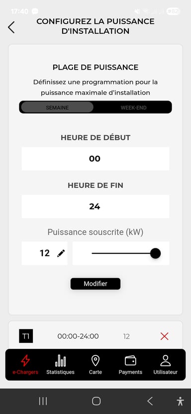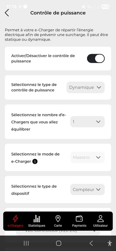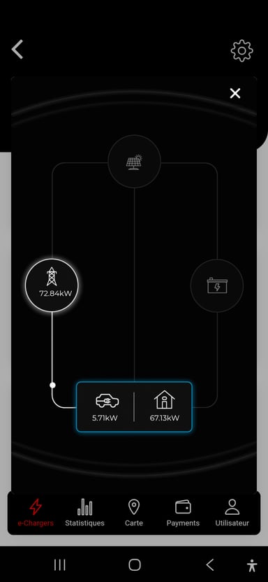 Ensuite, nous réglons la fonction de délestage appelée « contrôle de puissance ». L’application demande notamment la puissance souscrite au compteur, 12 kVA dans notre cas, afin de ne jamais la dépasser. Nous avons tenté, en vain, de faire disjoncter notre compteur Linky en démarrant une charge et allumant de nombreux appareils très consommateurs. La borne est bien parvenue à réduire la puissance de charge de façon très réactive dans tous les cas. Nous relevons seulement des informations de puissances parfois erronées dans le diagramme de l’application, qui, au moment du crash-test, affichait une puissance démentielle de 72,8 kW tirée du réseau !