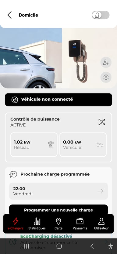 Outre la lenteur de la recharge, qui ne dépasse pas les 3,7 kW, la prise classique à elle seule ne permet pas de programmer des horaires de recharge, de consulter ses consommations et encore moins d’assurer le délestage ni l’optimisation de l’autoconsommation solaire.
