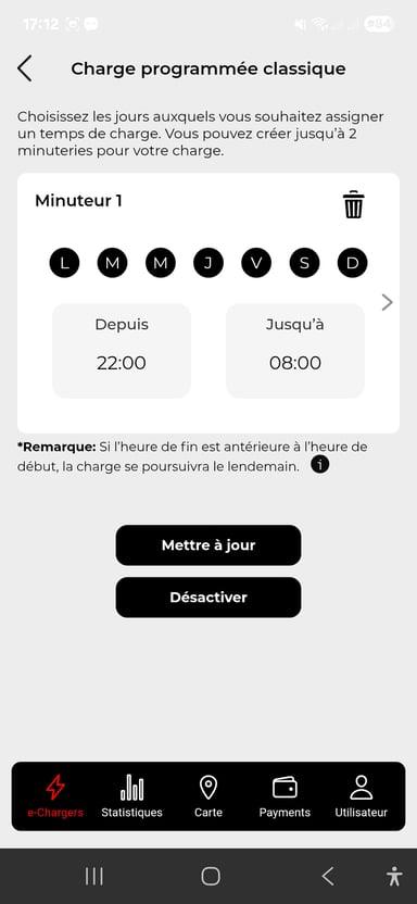 Pour recharger au tarif le moins cher de notre option Tempo du tarif réglementé (tarif bleu d’EDF), nous avons facilement paramétré des horaires de recharge dans l’application V2C. Dans notre cas, c’est simple : les heures creuses sont actives tous les jours de 22 h à 6 h. Pour ceux dont le contrat de fourniture d’électricité est plus complexe (tarif week-end, par exemple), il est possible de régler différentes plages sur différents jours de la semaine. Seuls les tarifs de marché en temps réel peuvent être enregistrés automatiquement.