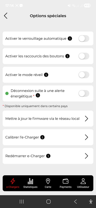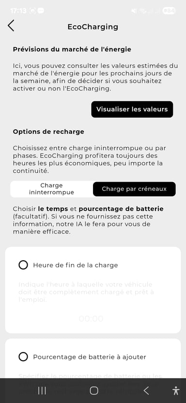 Une fonction plus avancée baptisée « Ecocharging » permet d’activer automatiquement la recharge en fonction du prix de l’électricité en temps réel. Cette fonction n’est toutefois pas pertinente pour la France, les prix affichés étant ceux de territoires espagnols et les contrats dynamiques étant rares dans notre pays. A minima, l’option « déconnexion suite à une alerte énergétique » permet de désactiver la charge lorsqu’un signal Ecowatt rouge est activé par RTE, ce qui n’est jamais arrivé à ce jour.