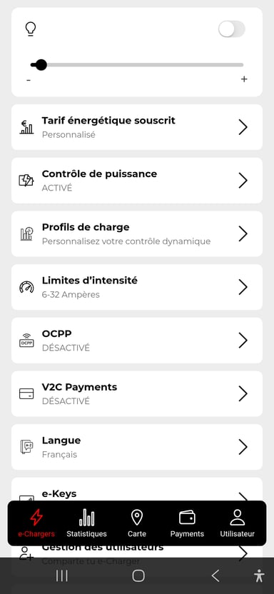 Sur l’application, très complète et régulièrement mise à jour, nous ajustons d’abord la luminosité de la borne, par défaut élevée. Nous désactivons complètement l’éclairage RVB du logo et réduisons au maximum le rétroéclairage de l’écran, par souci d’économies d’énergie et de confort visuel.