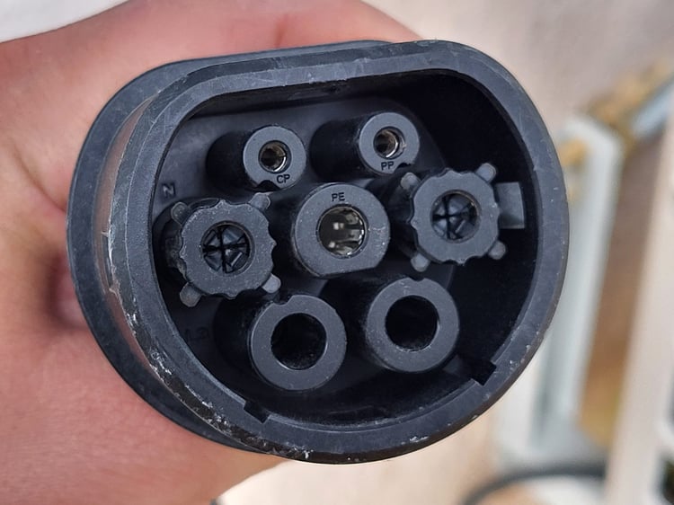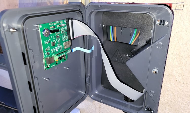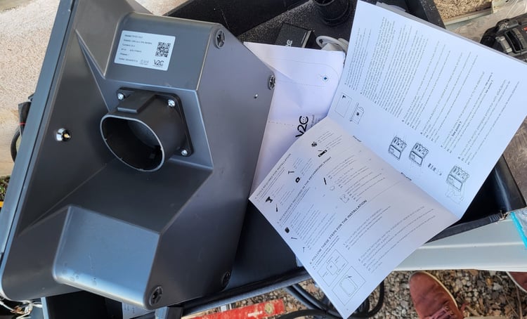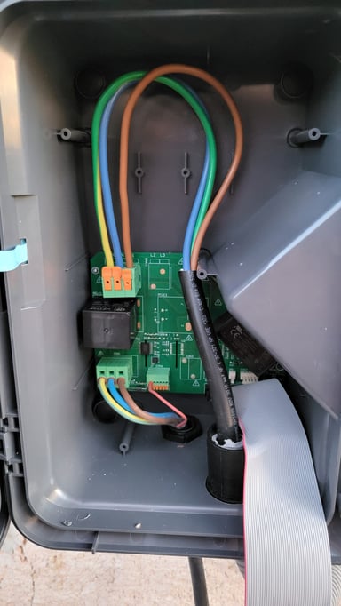 Dans la gaine qui abrite le câble d’alimentation, nous avons également glissé un petit câble Ethernet permettant d’assurer la connexion entre la borne et le boîtier V2C Controlbox dédié au délestage. Un port Ethernet (qui ne peut pas servir à une connexion internet) est bien sûr présent sur la carte électronique de la borne, comme sur le boîtier.