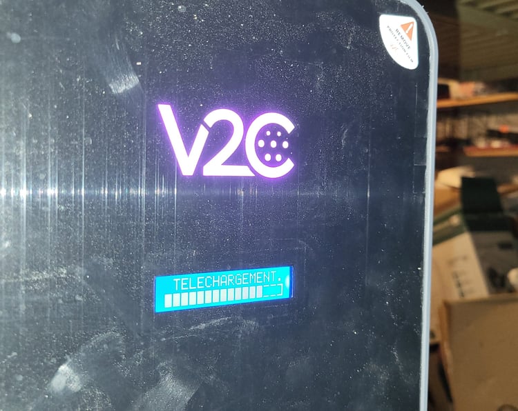La borne V2C Trydan s’allume, le logo du fabricant s’éclaire de multiples couleurs et le petit écran LCD très rétro affiche des informations en espagnol. Si la borne est déjà prête à recharger un véhicule, l’idéal est de configurer la wallbox au moyen de l’application smartphone V2C. L’appairage s’effectue d’abord en Bluetooth, afin de communiquer les informations du réseau wifi à la borne.