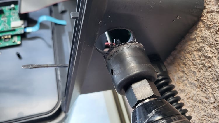 Avant l’installation de la borne, nous avons donc calculé la section de câble à acheter en fonction de la distance entre le tableau électrique principal et de la puissance maximale. Nous avons opté pour du câble en 3 x 10 mm², légèrement supérieur à ce qui est préconisé, pour franchir les 5 mètres qui séparent le tableau de la borne, par sécurité. Dans le tableau électrique principal, sur une rangée dédiée, nous avons placé un interrupteur différentiel 63 A de type F (HPI) ainsi qu’un disjoncteur courbe C de 40A. Sous la borne, il faut ensuite percer un passage pour le câble au moyen d’une scie cloche.