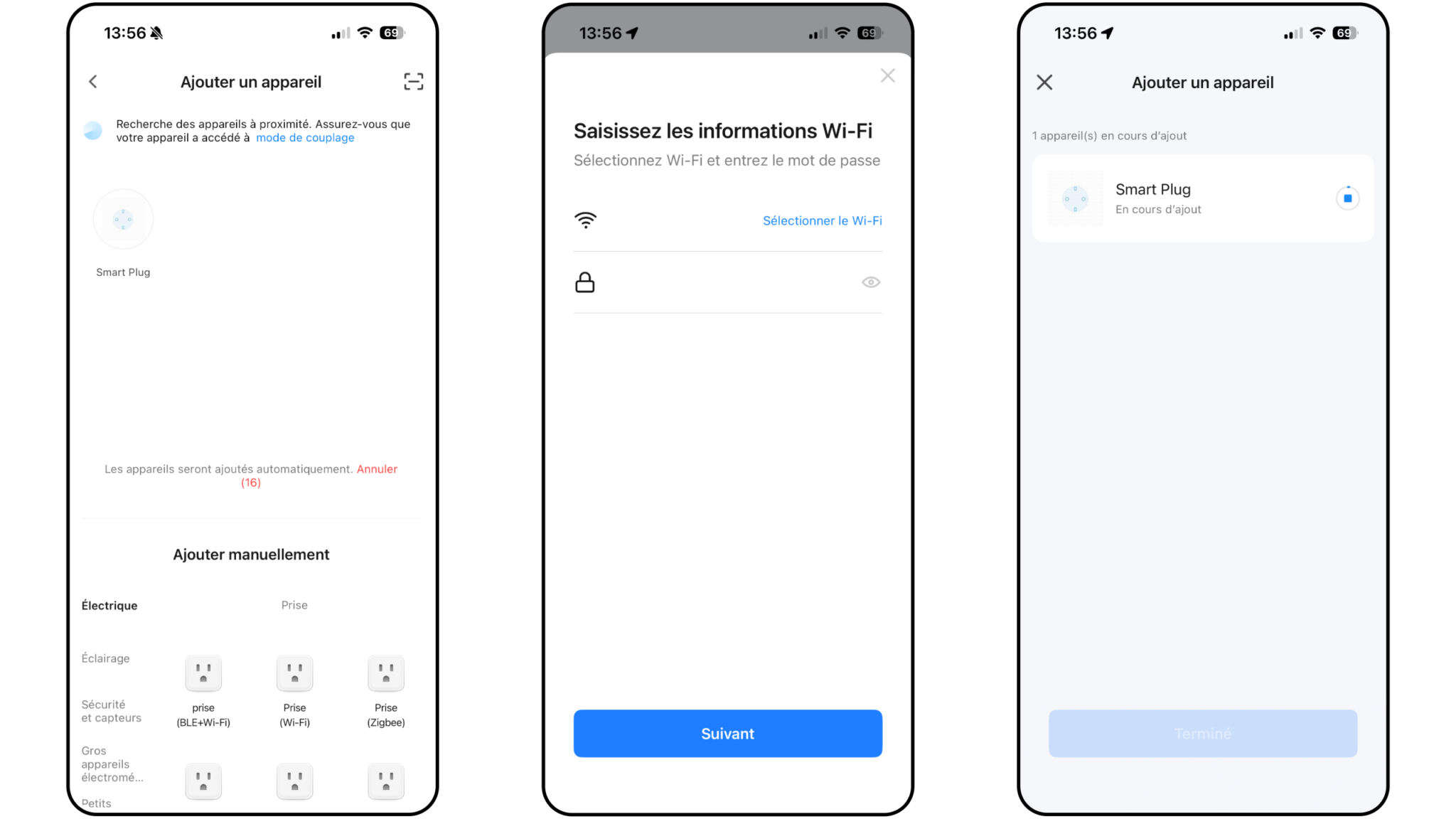 Il suffit, en effet, d’activer le Bluetooth, puis d’ouvrir l’application Smart Life. Depuis la page d’accueil, il faut cliquer sur la croix en haut à droite, et sélectionner sur « Ajouter un appareil ». En quelques secondes, la prise connectée apparaît sous le nom de Smart Plug. Il n’y a plus qu’à saisir les détails de votre Wi-Fi, puis d’attendre l’installation.
