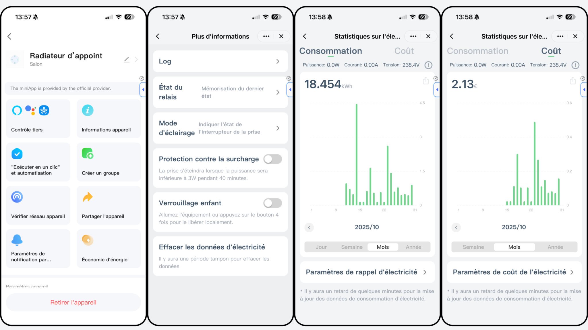 Un graphique permet de consulter la consommation par jour, par semaine ou par mois. Il est même possible de connaître le coût en euros en renseignant le tarif de l’électricité. Dommage, cependant, que ces données soient propres à chaque appareil.