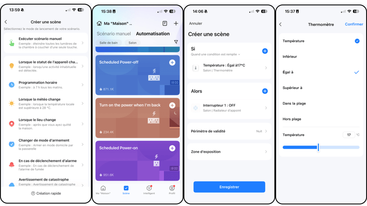 Outre ces fonctionnalités simples, Smart Life permet de créer des scénarios. C’est précisément ce qui nous intéresse. L’application nous a permis d’allumer ou d’éteindre le radiateur en fonction de la température intérieure. Cette dernière est obtenue grâce à un thermomètre connecté. Dans notre cas, nous avons créé deux scénarios :